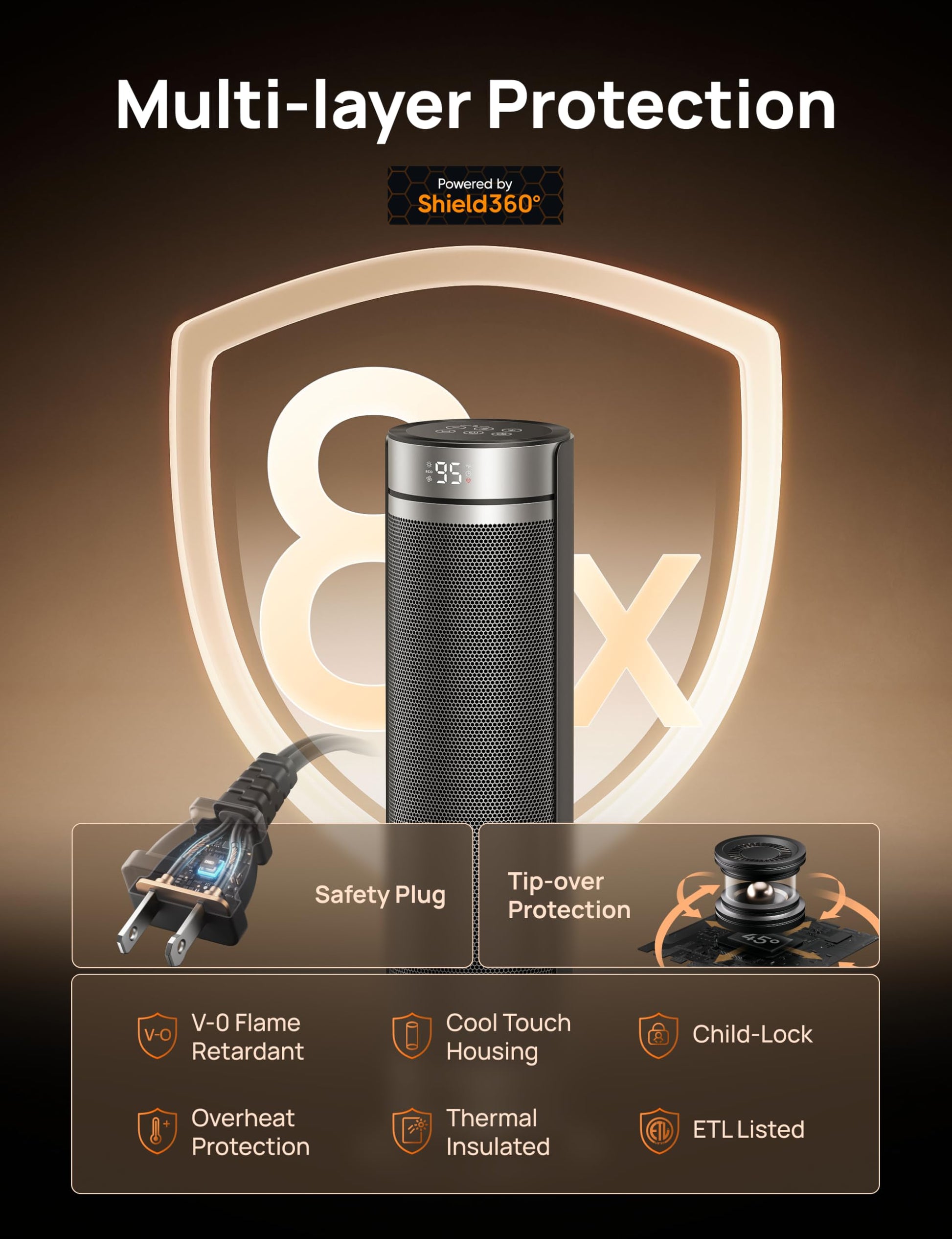 - Worry-free warmth: With child-lock, safety plug, overheat, tip-over protection and cool-touch housing, this ETL-listed electric heater provides safe, efficient warmth indoors.