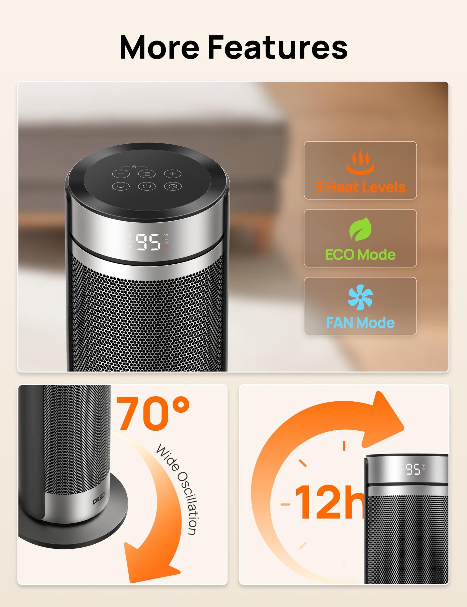 - Energy-efficient heating: Save up to 40% on energy with ECO mode, along with precise temp control (41-95°F) in 1°F increments, 3 heat levels, and a fan mode for optimal comfort.