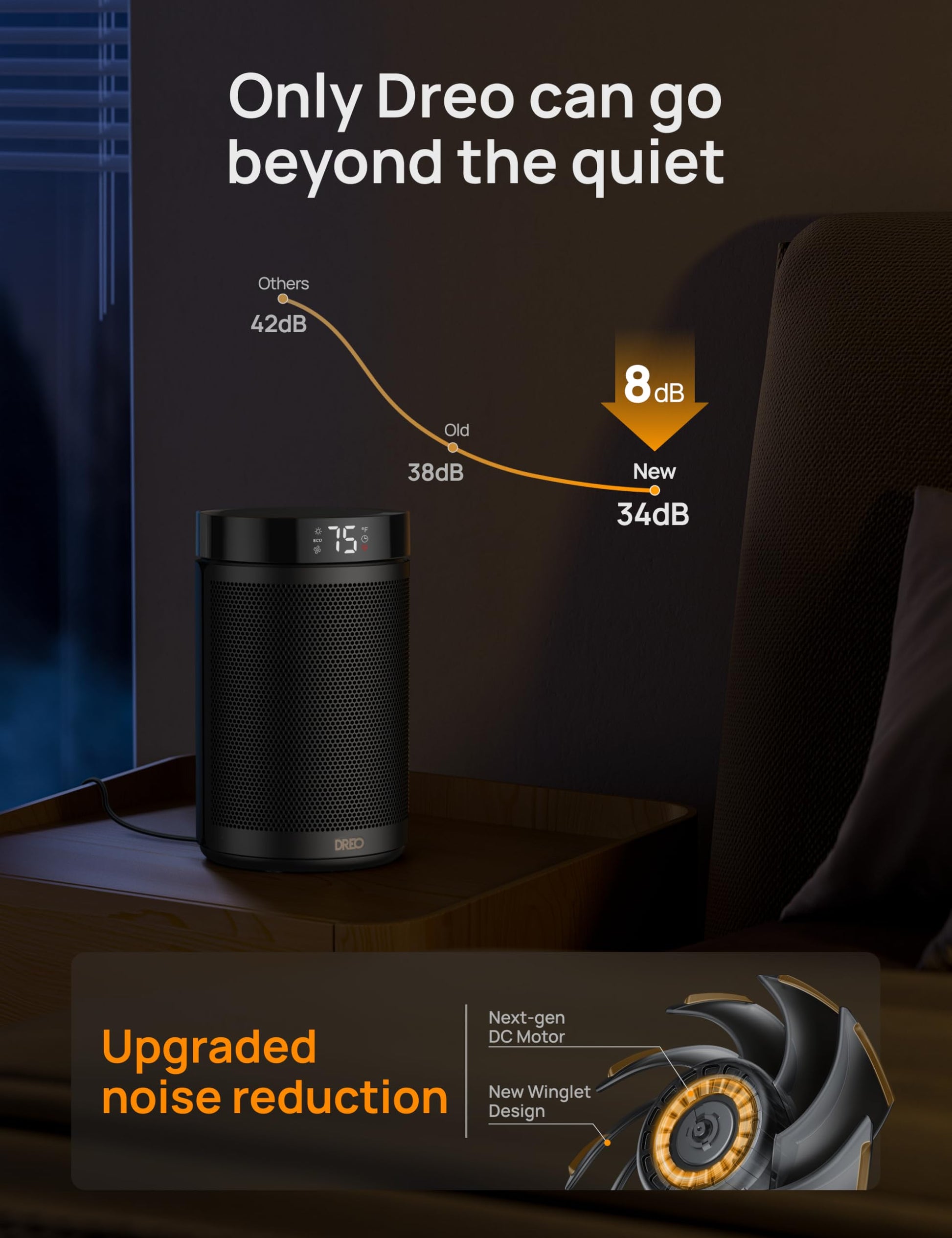 - Cozy quietness: No more choosing between quiet or warmth, Dreo's heater for bedroom warms quietly thanks to its brushless DC motor with frictionless performance and a winglet fan design that reduces turbulence, reducing noise to only 34dB.