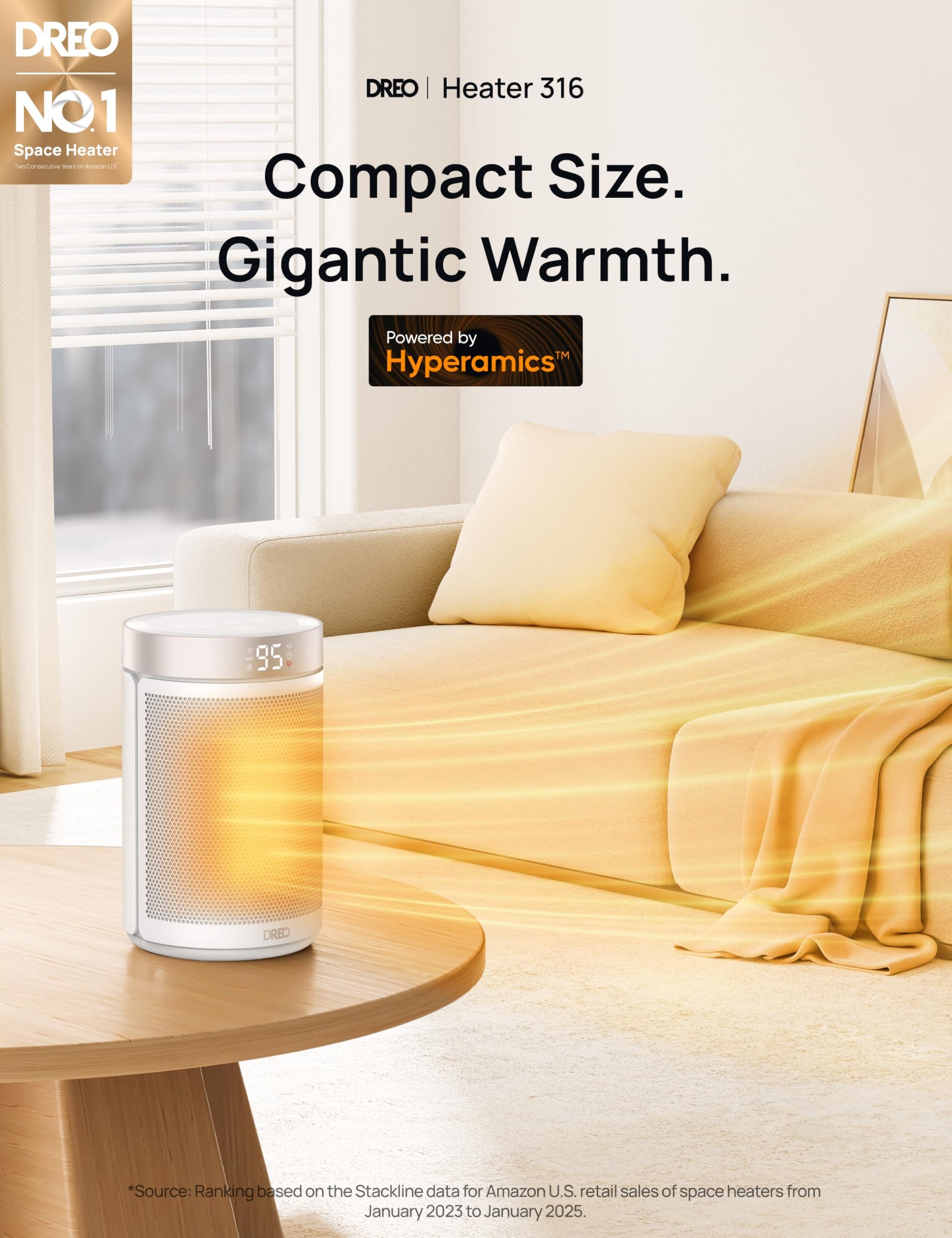 - Powerful heat that fits everywhere: Dreo space heaters for indoor combines Hyperamics 1500W advanced PTC system with a new heat funnel design to deliver heat within seconds and enhance warm air circulation for up to 200% farther reach than traditional heaters.